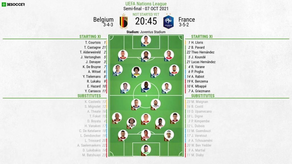 France vs Belgium Totalsportek Belgium is going head to head with France starting on 7 Oct 2021 at 2345 pm at Allianz Stadium stadium Turin city Italy. The match is a part of the UEFA Nations League Finals. Suivez en live sur Foot Mercato le match de Demi-finales de UEFA Nations League entre Belgique et France.